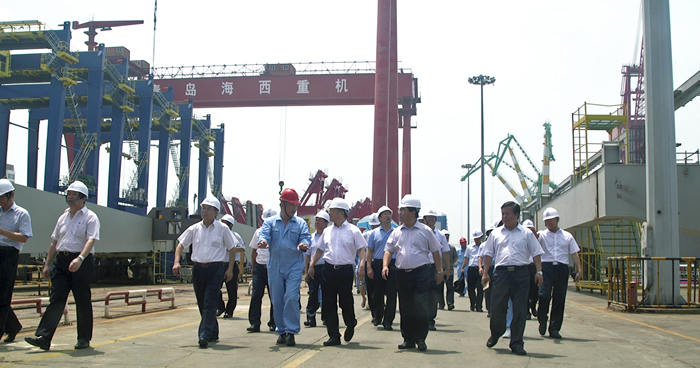 在海西重機總裝現(xiàn)場,張德平副市長實地考察了待批量發(fā)往黎巴嫩的岸橋和輪胎吊項目、發(fā)往馬來西亞的帶斗門機項目、發(fā)韓國鮮光新港的軌道吊項目及承制、調試的功能性海工平臺項目等。并聽取了海西重機董事長孫國慶關于企業(yè)上半年經(jīng)濟運行情況、轉型升級取得的成績以及在目前經(jīng)濟形勢下的合同承接情況。