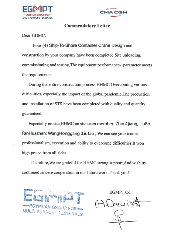 亞歷山大港多用途碼頭為埃及國家重點(diǎn)項(xiàng)目,埃及國家領(lǐng)導(dǎo)人員高度關(guān)注該項(xiàng)目進(jìn)展。岸橋到達(dá)用戶碼頭后,項(xiàng)目組嚴(yán)格按照策劃節(jié)點(diǎn)穩(wěn)步推進(jìn)每天工作,確保當(dāng)日事當(dāng)日畢,最終在整個項(xiàng)目組通力協(xié)作以及用戶的積極配合支持下,岸橋順利完成交付,并按計(jì)劃進(jìn)入保產(chǎn)。期間,埃及總理、交通部部長對海西重機(jī)產(chǎn)品及現(xiàn)場項(xiàng)目團(tuán)隊(duì)給予了充分肯定,多家當(dāng)?shù)孛襟w對此進(jìn)行了專題報(bào)道。用戶特地向我司發(fā)來一封表揚(yáng)信以示感謝。