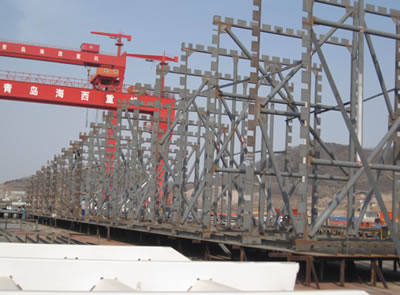 天津新港600T造船龍門吊是青島海西重機(jī)有限責(zé)任公司承接的第一臺(tái)大型龍門起重機(jī),合同總額1.05億元,是公司關(guān)鍵項(xiàng)目。公司領(lǐng)導(dǎo)高度重視,專門成立了以公司總經(jīng)理為組長(zhǎng)的項(xiàng)目組,在全公司實(shí)施精品戰(zhàn)略,本著“作一臺(tái)設(shè)備,占一片市場(chǎng),交一個(gè)朋友”的宗旨,從聯(lián)合設(shè)計(jì)到注重制造的每一個(gè)細(xì)節(jié),海西重機(jī)都組織了多次討論,全力保證產(chǎn)品質(zhì)量。