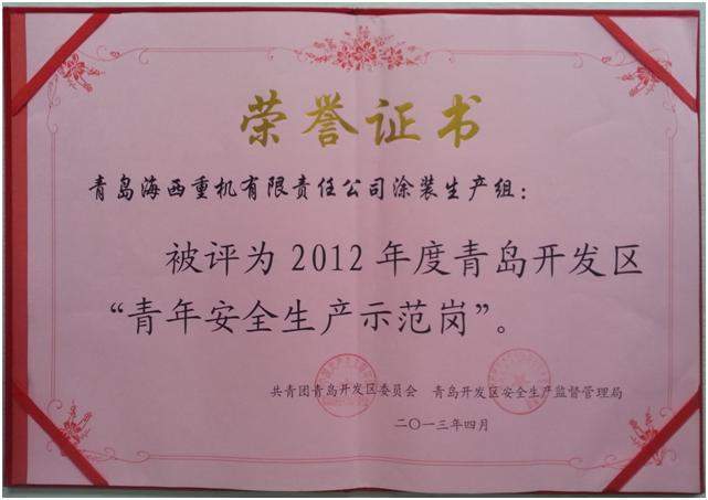 近日,青島海西重機(jī)涂裝生產(chǎn)組喜獲殊榮,獲評(píng)2012年度青島開發(fā)區(qū)“青年安全生產(chǎn)示范崗”榮譽(yù)稱號(hào)!