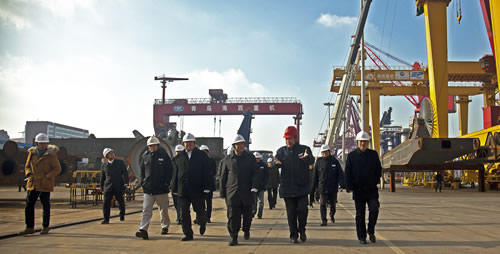 許克振一行實地考察了海西重機生產(chǎn)現(xiàn)場及組裝發(fā)運現(xiàn)場,參觀了包括韓國批量岸橋、自動化軌道吊等在內(nèi)的港口機械設(shè)備及在制的批量自升式海工平臺項目,看望慰問了生產(chǎn)一線干部職工,并在隨后召開的中船重工青島海西灣基地相關(guān)企業(yè)負責人座談會上,聽取了海西重機董事長孫總關(guān)于企業(yè)產(chǎn)品結(jié)構(gòu)、技術(shù)創(chuàng)新、生產(chǎn)經(jīng)營及中長期發(fā)展規(guī)劃等方面的情況匯報。